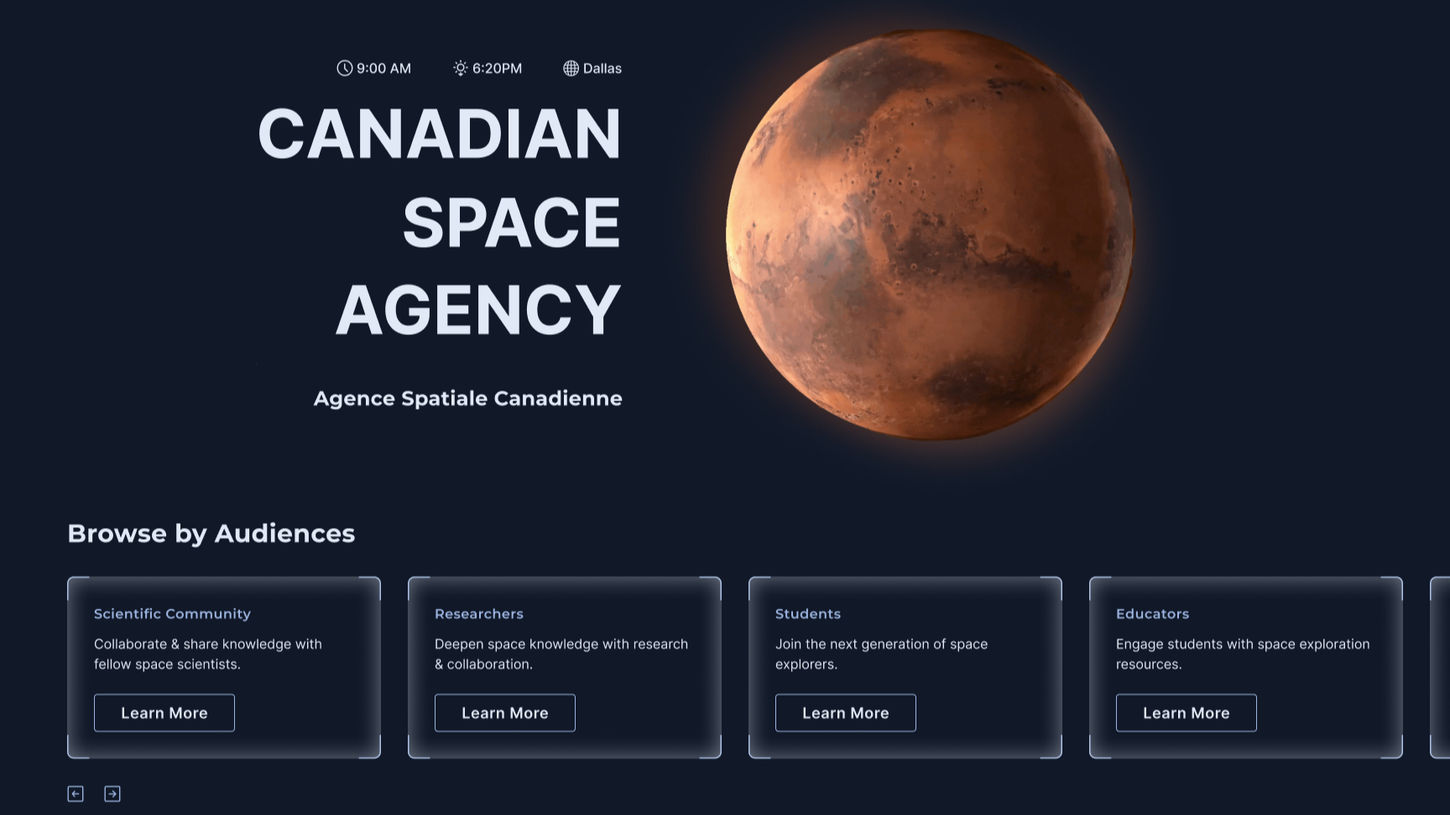 The Canadian Space Agency (CSA) provides information on space exploration and aeronautics. We recently conducted a usability test to improve our website. Based on user feedback, we'll focus on enhancing content for:
